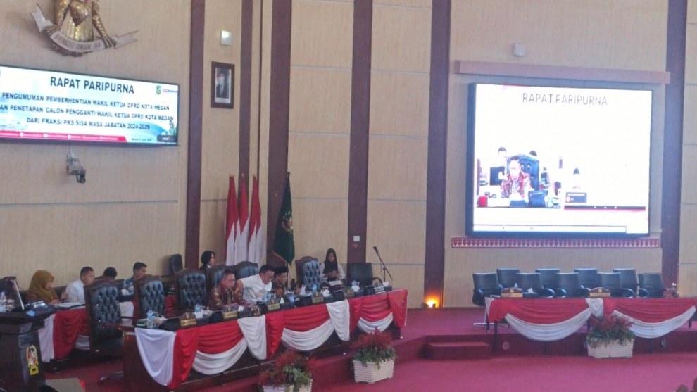 “Sesuai dengan hasil rapat badan musyawarah DPRD Kota Medan tanggal 20 april 2026 telah menetapkan jadwal rapat paripurna pada hari ini dalam acara pengumuman pemberhentian Wakil Ketua DPRD Kota Medan dan penetapan calon pengganti wakil Ketua DPRD Kota Medan dari Fraksi PKS sisa masa jabatan 2024-2029, “kata Wong mengawali sidang.