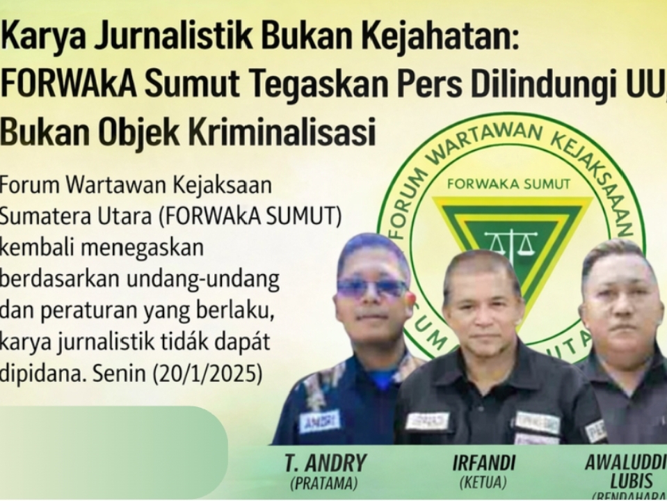 PORTALSWARA.COM — Forum Wartawan Kejaksaan Sumatera Utara (FORWAkA SUMUT) kembali menegaskan bahwa karya jurnalistik bukan kejahatan dan tidak dapat dipidana, meskipun Kitab Undang-Undang Hukum Pidana (KUHP) baru sebagaimana diatur dalam Undang-Undang Nomor 1 Tahun 2023 telah berlaku. Penegasan ini disampaikan berdasarkan undang-undang, peraturan perundang-undangan, serta putusan Mahkamah Konstitusi (MK) yang secara konsisten melindungi kemerdekaan pers.