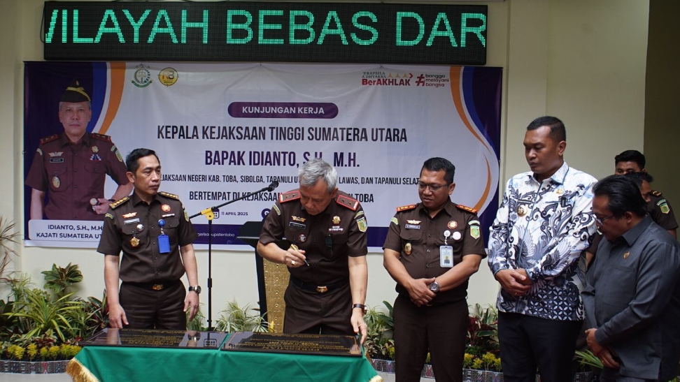 Kajati Sumut Idianto menyampaikan terima kasih kepada Kepala Kejaksaan Negeri Kabupaten Toba bersama Forkopimda atas penyambutan kehadiran mereka di Kabupaten Toba. Kehadirannya di Kabupaten Toba tidak sekadar penandatanganan prasasti tetapi juga dalam rangka penilaian WBK (Wilayah Bebas dari Korupsi).