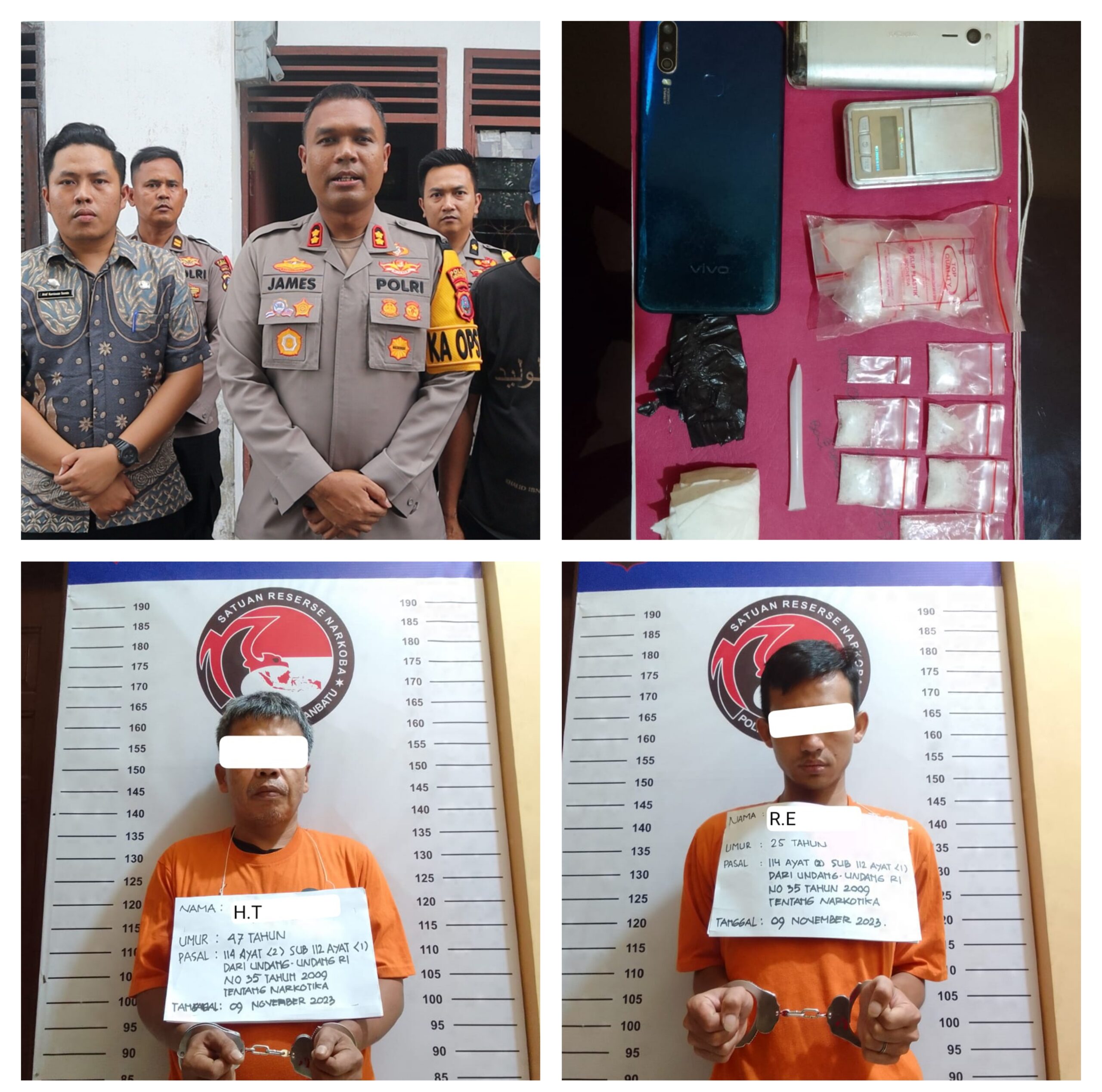 Dua pelaku yang berhasil diamankan tim Opsnal Satresnarkoba, yakni, HT (47) warga Lingkungan Padang Bulan, Kecamatan Rantau Utara, Kabupaten Labuhanbatu dan RA (25), warga Jalan Perisai, Kelurahan Bakaran Batu, Kecamatan Rantau Selatan, Kabupaten Labuhanbatu. Keduanya diamankan Kamis (09/11/2023) sekira pukul 15.00 WIB, di sebuah rumah di Jalan Padang Bulan.