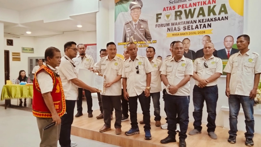 PORTALSWARA.COM — Ketua Forum Wartawan Kejaksaan (Forwaka) Sumatera Utara, Irfandi, secara resmi melantik sekaligus menyerahkan surat keputusan (SK) kepengurusan Forwaka Nias Selatan periode 2026–2028 yang berlangsung di Aula Kejaksaan Negeri Nias Selatan, Jalan Diponegoro, Kecamatan Teluk Dalam, Selasa (28/04/2026).
