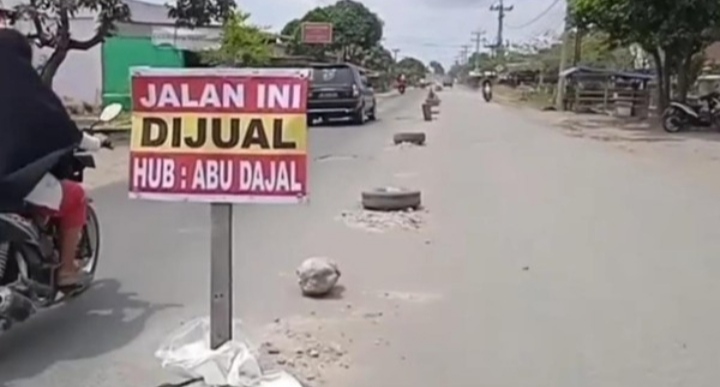 Dalam video yang dilihat Senin (20/02/2023), terlihat warga meletakkan ban di setiap lubang yang ada di Jalan Tengku Amir Hamzah itu. Selain ban, warga juga terlihat membuat poster yang bertuliskan jalan tersebut dijual.