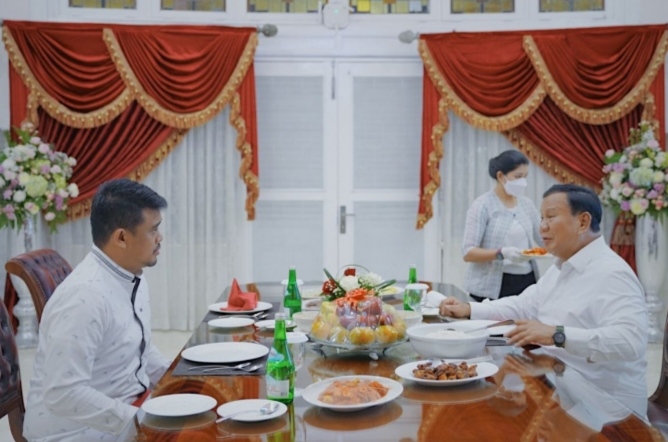 Prabowo Menikmati Suguhan Roti Jala Bobby Nasution