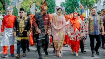 Walikota Medan Bobby Nasution dan Ketua TP PKK Kota Medan Kahiyang Ayu ikut memeriahkan Pawai Colorful Medan Carnival dengan berpakaian adat Simalungun.
