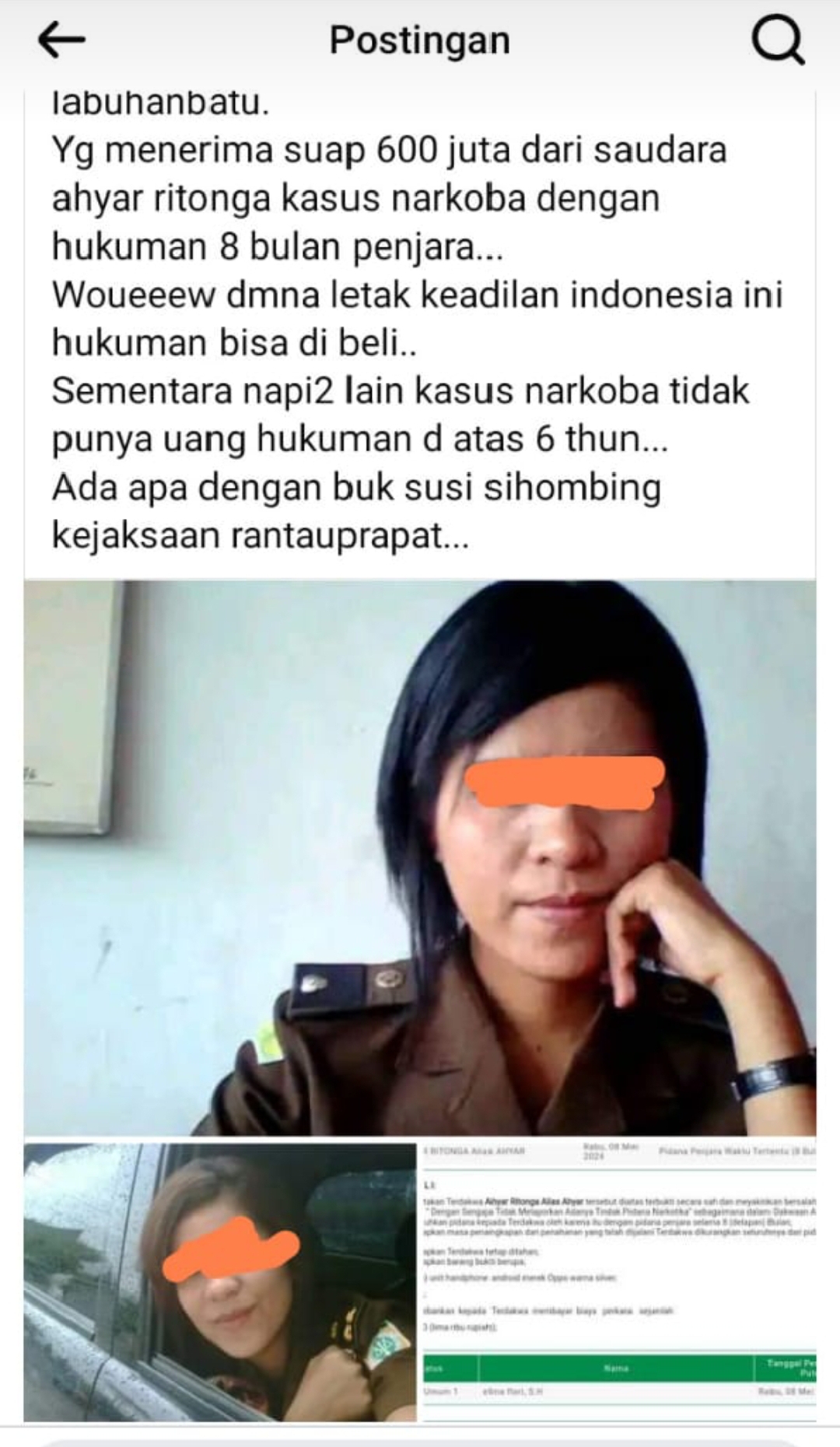 Ada apa dengan buk susi sihombing kejaksaan rantauprapat…”, tulis akun Facebook atasnama Anggara Syahputra.