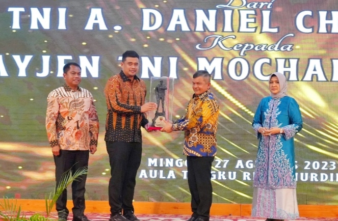 Saat acara lepas sambut, Walikota Medan Bobby Nasution memberikan cendera mata kepada Mayjen TNI A Daniel Chardin, sebagai bentuk kenang-kenangan sekaligus ucapan terimakasih atas dukungan selama ini kepada Pemko Medan.